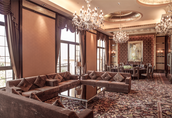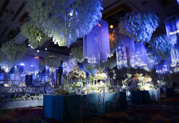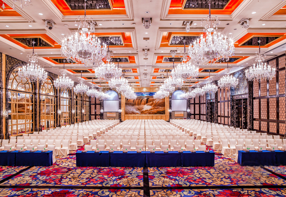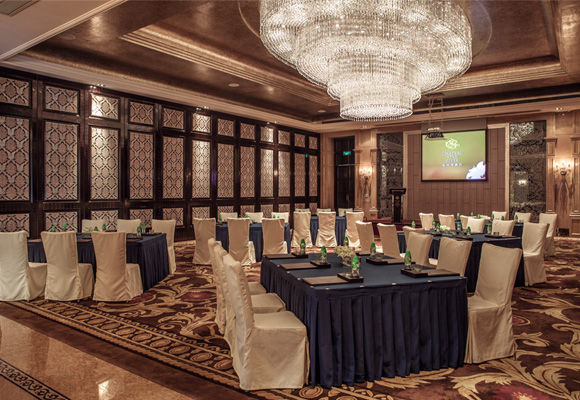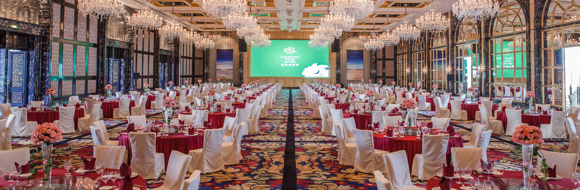 高雅别致的装潢与先进商务配套设施,全场采用无柱式设计,挑高8.4米,面积达1400平方米,全城首家P2.5高清LED超大显示屏,能高清呈现各种视像资料,令您的宴会色彩斑斓,彰显品质。