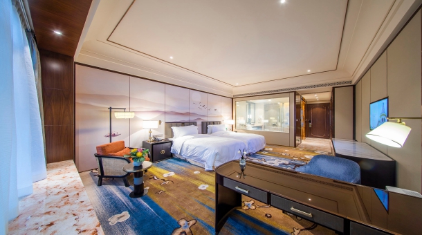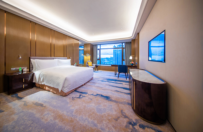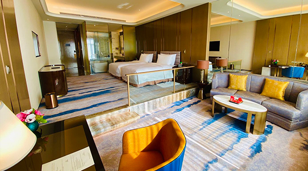 酒店拥有307间精美客房、2间主题餐厅、1间大堂吧,1间配备面积1200平方米、层高8.5米、配备54平方米超大LED显示屏的无柱式设计国际宴会厅,3间大小各异的多功能会议厅。康体中心设有室内恒温泳池、健身中心,专业的室内网球场、室内羽毛球场,让您在这里自如挥洒汗水,享受美好人生。